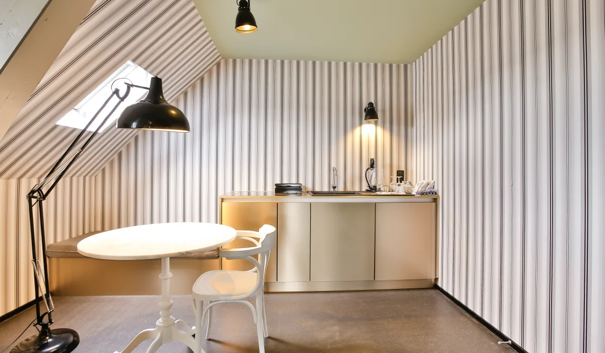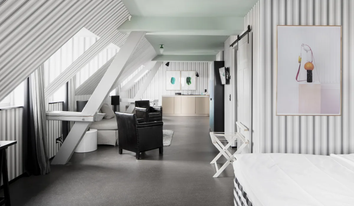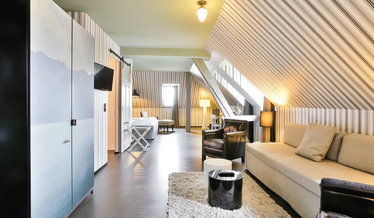 In unseren 2 Attic Junior Suiten schlafen Sie direkt im lauschigen Dachgeschoss und geniessen dabei eine besonders luxuriöse Einrichtung mit grossem Bett, Lese-Fauteuil, zusätzlichem Bettsofa und eigener Kochnische.